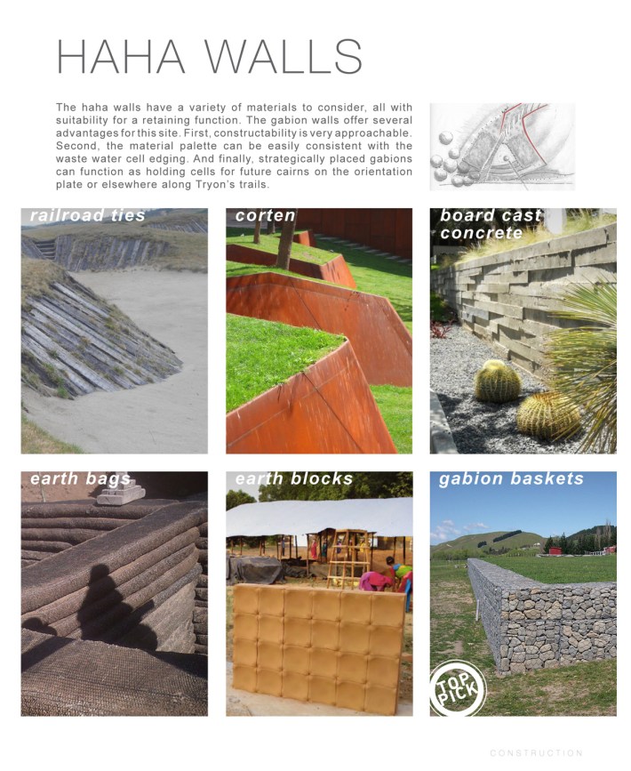 “A ha-ha (or ha-ha wall) is a recessed landscape design element that creates a vertical barrier while preserving views. The design includes a turfed incline which slopes downward to a sharply vertical face, typically a masonry retaining wall. Ha-has are used in landscape design to prevent access to a garden, for example by grazing livestock, without obstructing views. In security design, the element is used to deter vehicular access to a site while minimizing visual obstruction. The name “ha-ha” derives from the unexpected (i.e., amusing) moment of discovery when, on approach, the recessed wall suddenly becomes visible.”