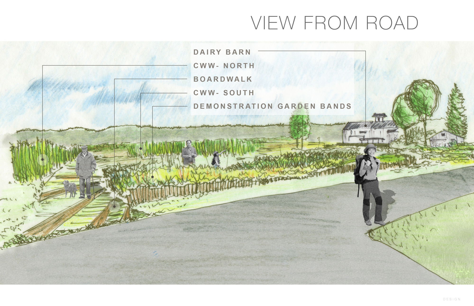 The surrounding bands of planted gardens provide an ecological demonstration function to educate visitors about the variety of ecological features they’ll encounter throughout the surrounding landscape.  site-plan view-from-north view-from-roadgarden-bands