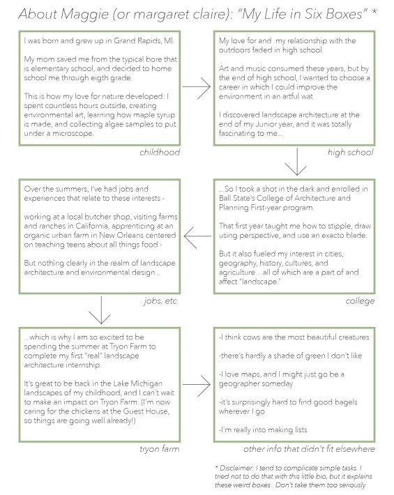 The “diagram” I made to introduce myself to the Tryon Farm community.