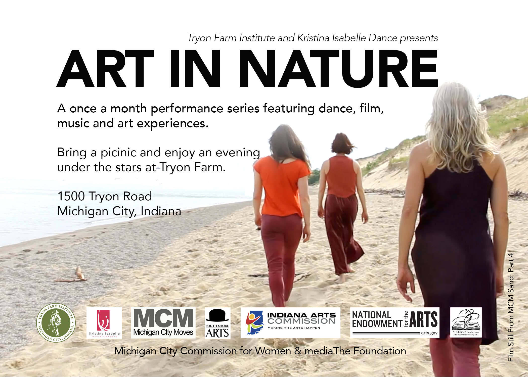 The Tryon Farm Institute in partnership with Kristina Isabelle Dance presents Art in Nature, a once a month performance series featuring dance, film, music and art experiences at Tryon Farm in Michigan City. Join us and bring a picnic to enjoy an evening under the stars exploring Art in Nature as we enrich the natural environment with movement, light and sound to build intimate connections between people and nature. The series opens July 20th and runs once a month through October 12th.