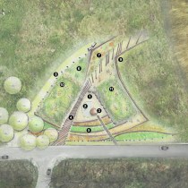 William ‘Billy’ Stratton, TFI’s landscape architecture graduate design intern from Ball State University, designed and installed a memorial “bosque” in August 2015 to be located on a natural overlook of Bailey Pond at Tryon Farm. A “bosque” is a landscape
